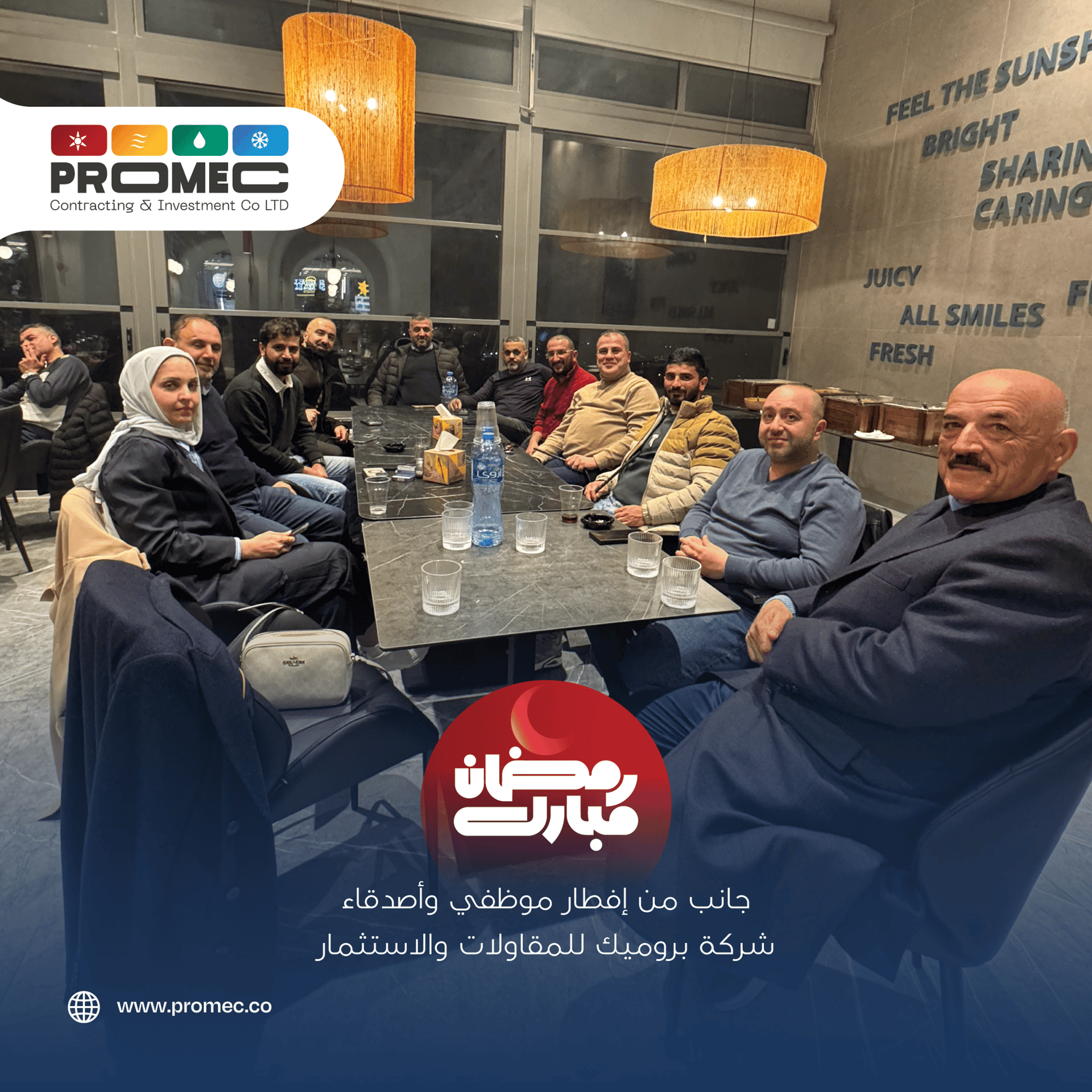 أقامت شركة بروميك للمقاولات والاستثمار إفطاراً رمضانياً في مدينة رام الله، بحضور مدير الشركة المهندس مراد القاسم، وبمشاركة موظفي الشركة وأصدقائها، في أجواء رمضانية عكست روح الألفة والتواصل بين أفراد عائلة الشركة.