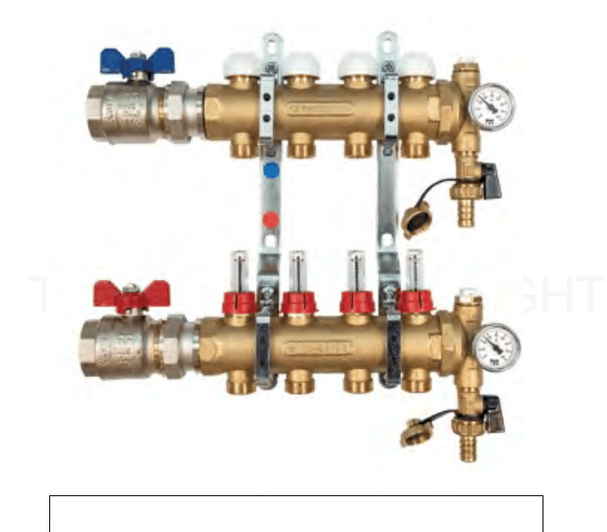 Water manifolds, fittings, and piping are essential components in underfloor heating systems. The manifolds distribute hot water evenly to various loops beneath the floor, ensuring consistent and efficient heating across the space. Fittings provide secure and leak-proof connections between pipes and the manifold, maintaining system integrity. The piping, typically laid out in loops under the floor, transports the hot water, transferring heat evenly to warm the surface. Together, these components ensure reliable and energy-efficient performance of the underfloor heating system.